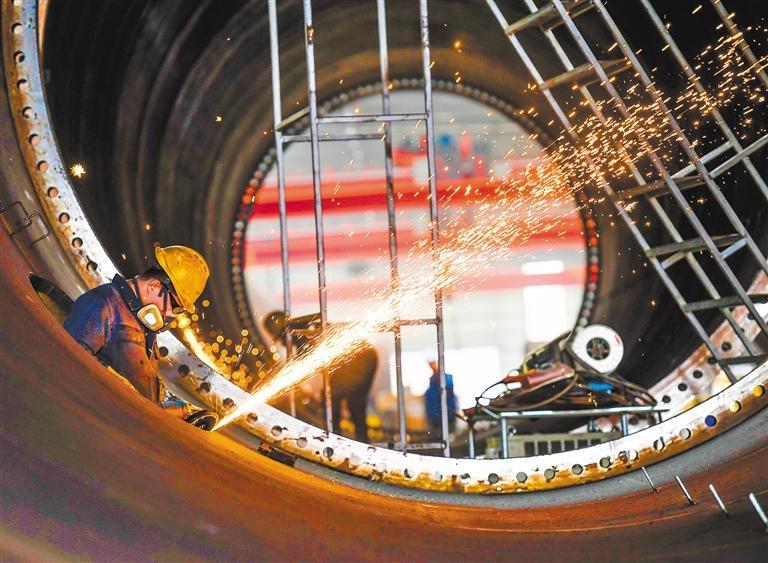 ▲江西省宜春市锦源新区,锦峰重工科技有限公司,员工在焊接风电塔筒。