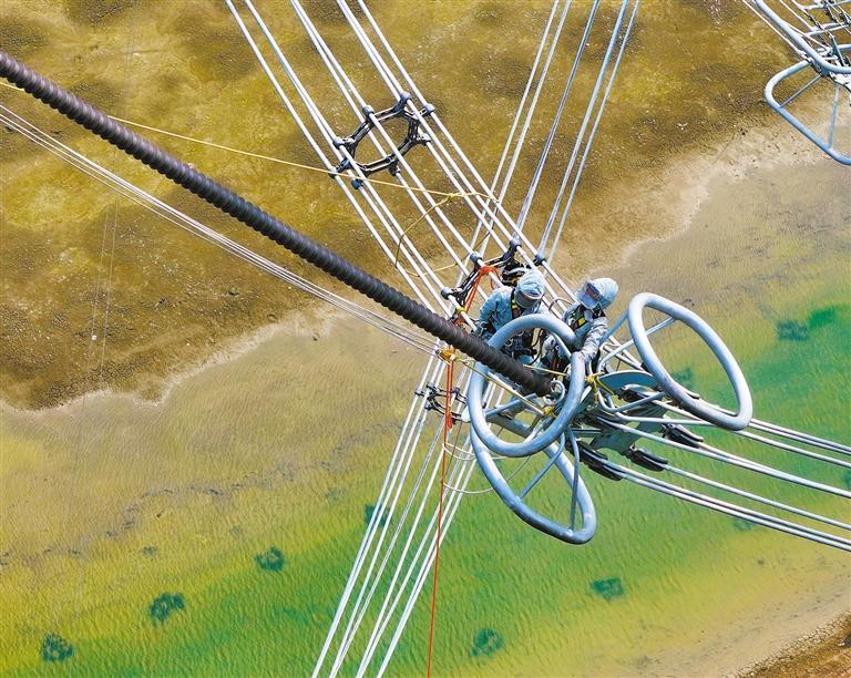▼江苏省金湖县金南镇,国网江苏电力技术人员在特高压换位塔更换跳线绝缘子串。该公司填补了我国带电更换百万伏特高压换位塔电气设备的技术空白。