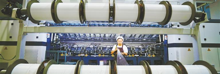 ▼福建省福州市福建辅布司纺织有限公司,员工在检查产品。