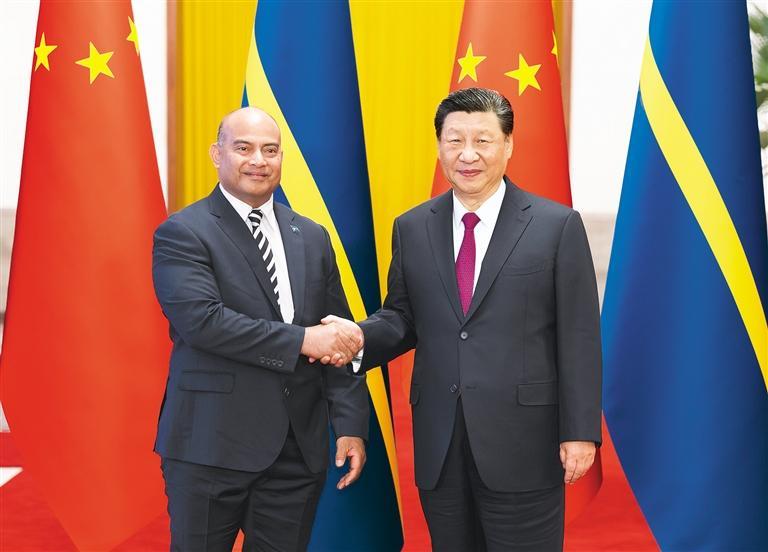 习近平指出,今年1月,瑙鲁作出坚持一个中国原则、同中国复交的政治决断,这是符合历史大势、顺应时代潮流之举。友好不分先后,只要开启,就会有光明前途。合作不论大小,只要真诚,就会有丰硕成果。中瑙关系已经翻开新的历史篇章。中方愿同瑙方一道,开创中瑙关系的美好未来,更好造福两国人民。