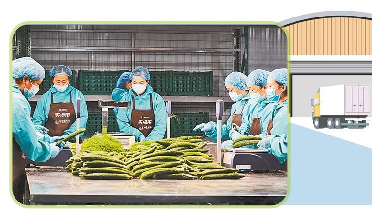 宝信物流通过联农带农发展10万余亩直采基地,不断探索农产品规模化出村进城途径,努力开拓更多销售渠道。“经过充分的市场调研,我们打造了具有本土特色的生鲜超市,一站式为城市家庭提供农特产品。”生鲜超市运营总监李建明说,公司一头连接田间地头,一头连接城市终端,通过全流程精细化管控,建设冷链仓储物流中心,实现农产品从田间地头直供消费者餐桌。目前,公司已设立10余家超市连锁店,正谋划开设100家新店。