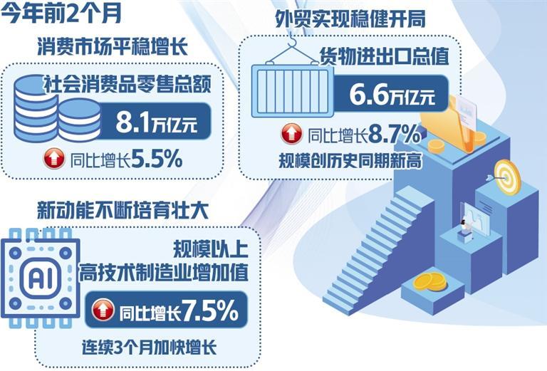 同时,外贸实现稳健开局。前两个月货物进出口6.6万亿元,增长8.7%,规模创历史同期新高,增速比去年四季度加快约7个百分点。从结构看,对新兴市场贸易较快增长;部分重点产品快于整体;民营企业占比提升,成为外贸发展的主力军。