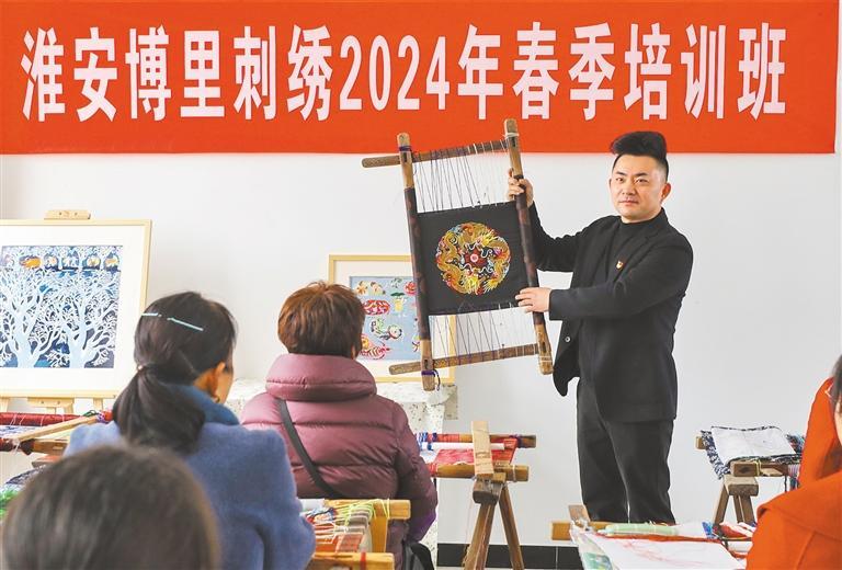 ④江苏省淮安市淮安区博里镇博里村开设刺绣春季培训班,招收本村及周边村民免费学习,帮助他们实现就业增收。赵启瑞摄(中经视觉)
