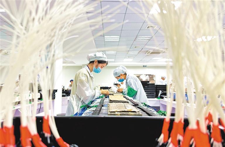 ③四川省仁寿县灿光光电有限公司,工人在生产线上忙碌。仁寿县通过上门送岗、带岗培训、引导企业增设钟点工和季节工等措施,吸引当地群众和返乡农民工在家门口就业。
