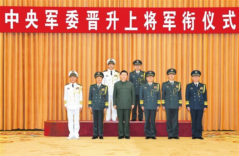 晋衔仪式在嘹亮的军歌声中结束。随后,习近平等领导同志同晋升上将军衔的军官合影。