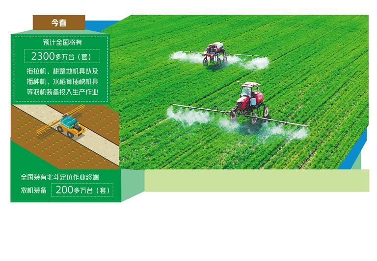 眼下,火热的春耕生产从南向北稳步推进,拖拉机、微耕机、插秧机、农用无人机大显身手。预计今春全国将有2300多万台(套)拖拉机、耕整地机具以及播种机、水稻育插秧机具等农机装备投入生产作业,春耕生产变得更智能、更高效、更轻松。