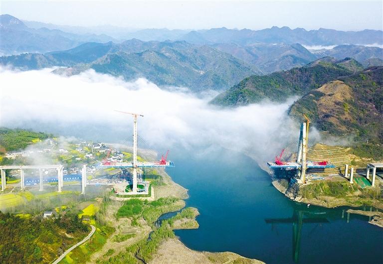3月28日,位于湖北省十堰市郧阳区五峰乡的十巫北高速(湖北十堰至重庆巫溪)汉江特大桥正在施工中,工程预计今年7月底完成主桥上部结构合龙,年底交工验收。曹忠宏摄(中经视觉)