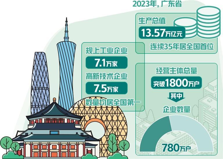 作为经济大省,广东坚决扛起挑起大梁的责任担当,筑牢夯实高质量发展的坚实基础。数据显示,2023年,广东全省生产总值达13.57万亿元,占全国的十分之一,连续35年居全国首位;经营主体总量突破1800万户,其中企业780万户,占全国的七分之一。今年以来,广东以稳预期、稳增长、稳就业为目标精准施策,着力扩投资、促消费、稳外贸,努力完成经济增长5%的目标任务。