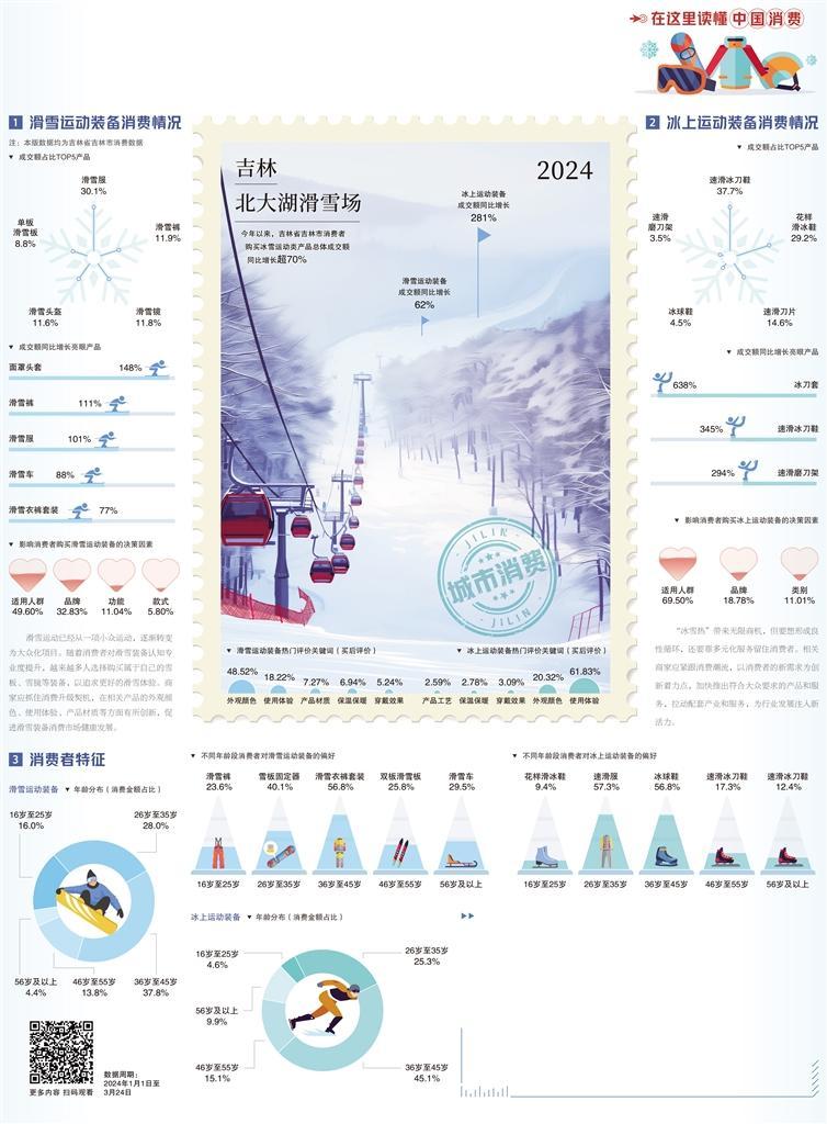 2023年至2024年雪季,吉林省吉林市立足得天独厚的冰雪资源优势,创新冬季文旅运营模式,点燃了文旅市场热情,带火了冰雪运动装备消费。