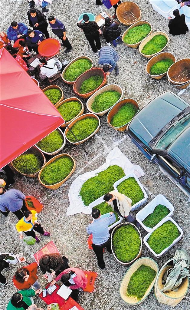 ▶湖北恩施市芭蕉侗族乡茶叶鲜叶交易市场,茶商和茶农在交易玉露明前茶。随着第一批新茶上市,大批茶商前来恩施“寻宝”。张远明摄(中经视觉)