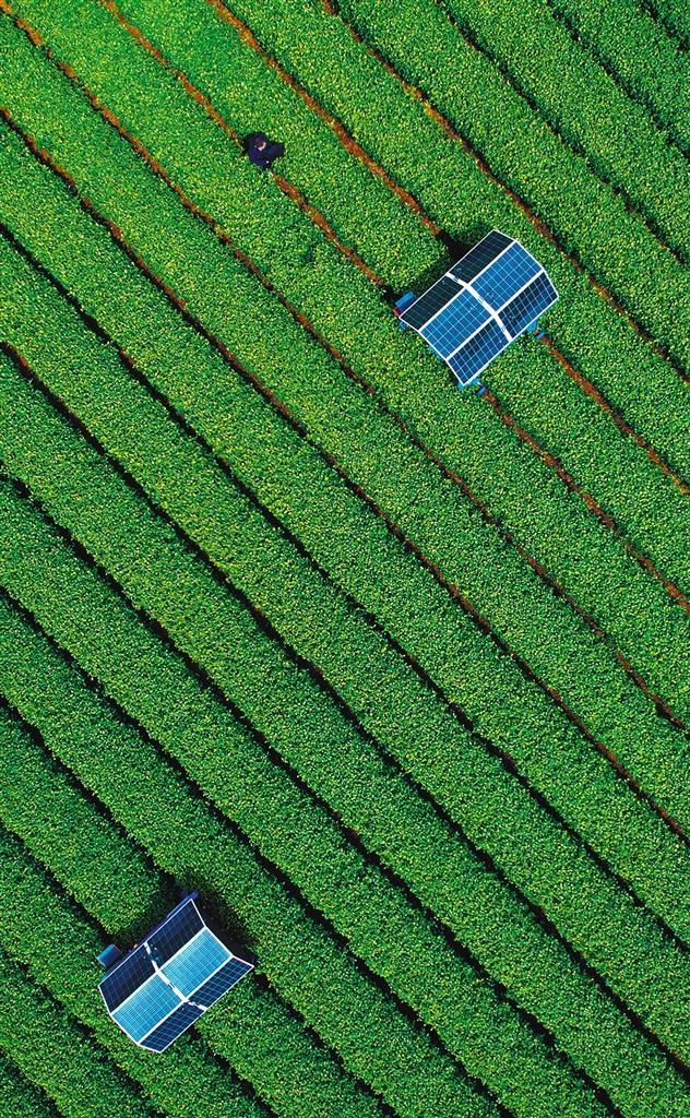 ◀浙江杭州西湖龙井原产地一级保护区的茶园里,AI采茶机器人在采摘明前茶嫩芽。龙 巍摄(中经视觉)