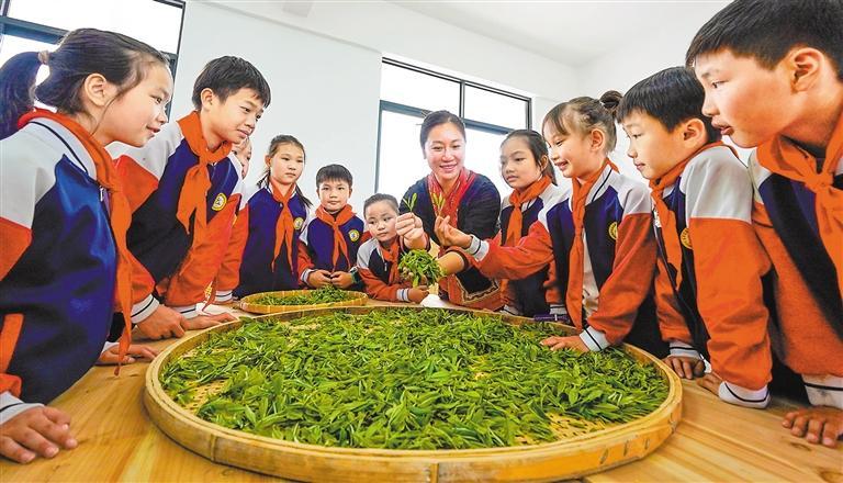 ◀学生们在广西金秀瑶族自治县大樟乡三古村茶产业研学基地学习茶叶制作技艺,体验中国传统茶文化。