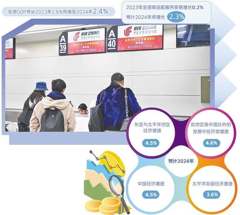 《东亚与太平洋地区经济半年报》显示,2024年,预计该地区除中国以外的发展中经济体增速为4.6%;中国经济增速为4.5%;太平洋岛国增速将从2023年的5.6%放缓至3.6%。