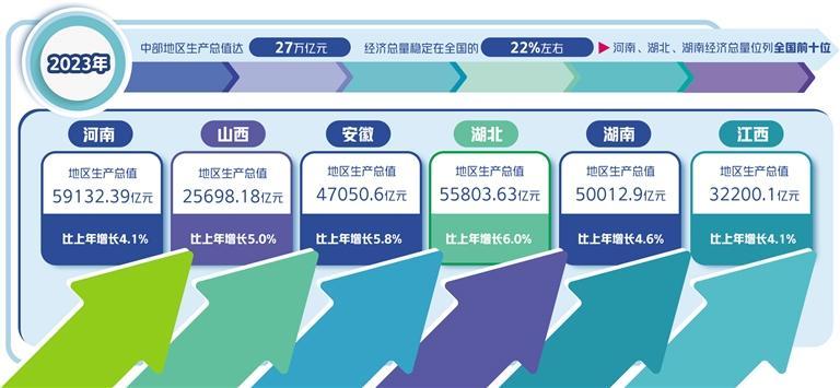 党的十八大以来,特别是2019年推动中部地区崛起座谈会召开以来,中部地区经济社会发展取得重大进展。中部六省以约占全国十分之一的国土面积,承载了约四分之一的人口数量,创造了约五分之一的经济总量,是我国重要粮食生产基地、能源原材料基地、现代装备制造及高技术产业基地和综合交通运输枢纽。