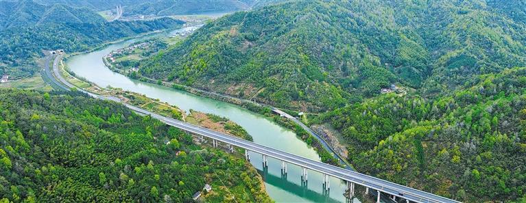 4月2日,在安徽省石台县风景秀丽的秋浦河畔,汽车行驶在德上高速公路和G237国道上。近年来,当地大力完善高速公路和城乡公路等综合立体交通,形成内外衔接、城乡互通、村村通覆盖乡村的交通网络,助推地方经济高质量发展。