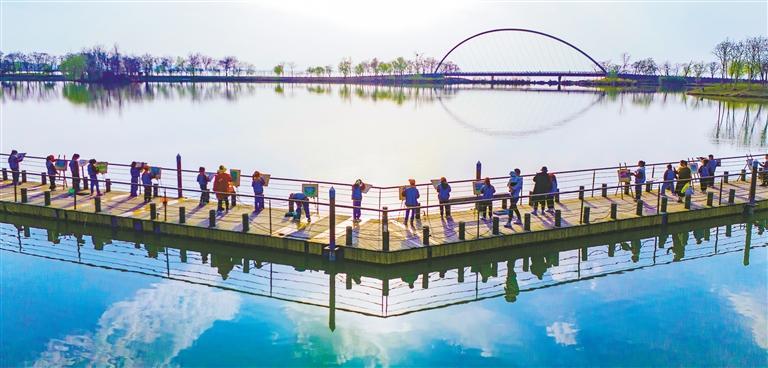 ▼3月22日,江苏省宿迁市湖滨新区骆马湖罗曼园,学生在写生,描绘春日美景。