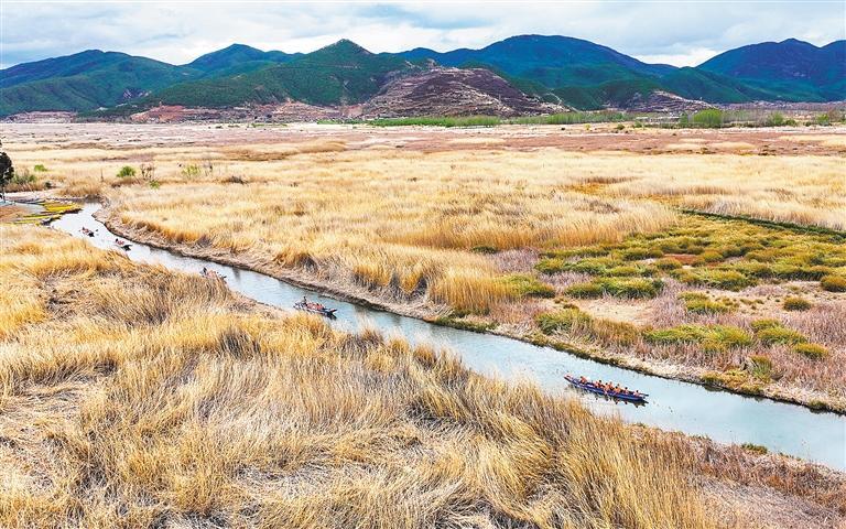 ◀4月1日,游客在四川省盐源县泸沽湖草海湿地乘船游览。