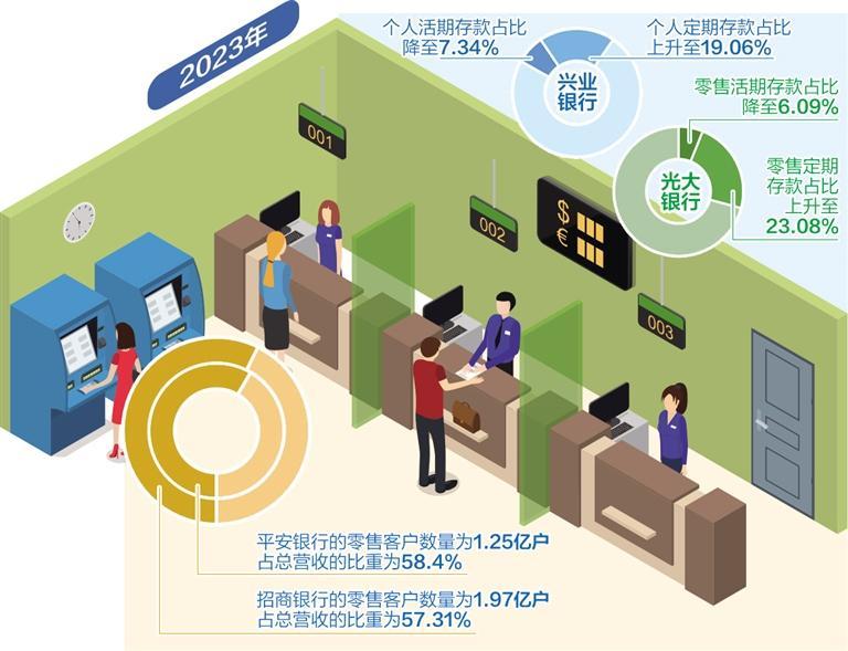 当前,愈演愈烈的“存款定期化”已经成为整个银行业面临的棘手挑战。从上市银行年报来看,中信银行、光大银行、兴业银行、民生银行等银行的零售存款均呈现出“活期降、定期升”的特点。如兴业银行个人活期存款占比由2022年的8.23%下降至7.34%,个人定期存款占比则由14.69%上升至19.06%;光大银行的零售活期存款占比由2022年的6.49%下降至6.09%,零售定期存款占比由20.6%上升至23.08%。