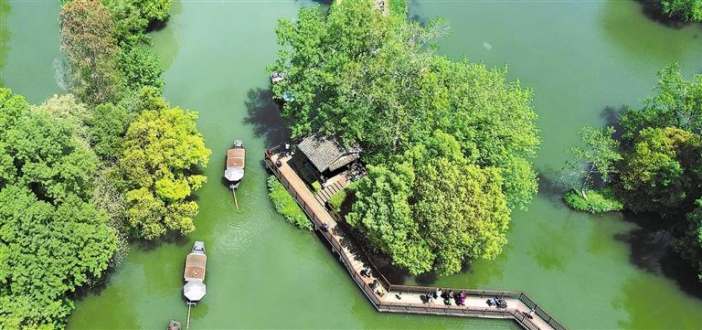 四月五日,俯瞰杭州西溪湿地。清明假期,杭州西溪湿地春光明媚、绿意盎然,吸引不少市民和游客前来踏青赏春。龙 巍摄(中经视觉)