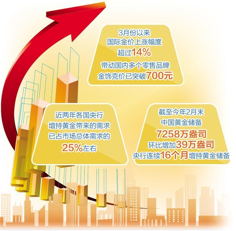 东方金诚首席宏观分析师王青认为,以美元计价的国际金价持续攀升有三方面原因:一是当前正处于美联储降息的预期升温阶段,黄金需求增加是正常的市场反应;二是年初以来多国央行仍在继续增持黄金,地缘政治风险的上升及全球贸易环境的高不确定性,让各国央行更加重视黄金储备,数据显示,近两年各国央行增持黄金带来的需求已占市场总体需求的25%左右;三是今年春节以来,国内民众购金热情高涨,除了季节性消费需求释放外,也与资本市场波动性加大、黄金投资属性凸显等因素有关。