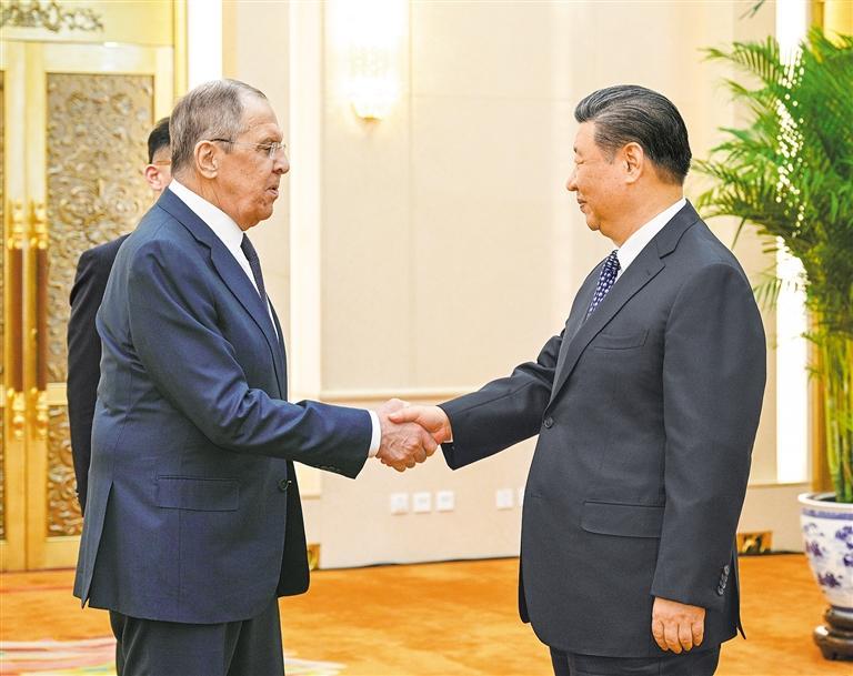 习近平请拉夫罗夫向普京总统转达诚挚问候。习近平指出,今年是中俄建交75周年。中俄两国携手走出了一条大国、邻国和睦相处、合作共赢的崭新道路,造福了两国和两国人民,也为国际公平正义贡献了智慧和力量。我和普京总统一致同意,继续保持密切交往,确保中俄关系始终顺利稳定向前发展。双方要以庆祝建交75周年和举办中俄文化年为契机,全面落实我和普京总统达成的一系列重要共识。