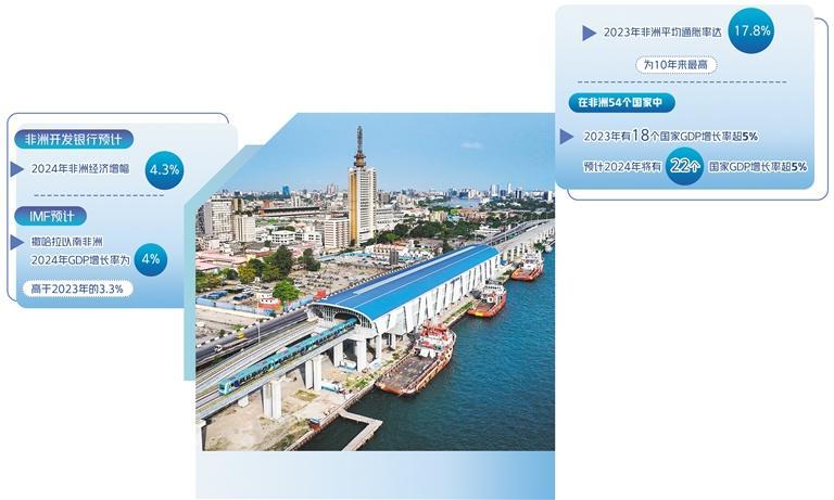 据非洲开发银行研究报告分析,与2023年相比,非洲私人投资和消费的增长预计将在2024年提振该地区约四分之三的经济体的增长。在经济增长加快的同时,非洲国家的通货膨胀也在下降。相关数据显示,非洲大陆的年通胀率在2022年12月达到峰值后趋于稳定,在2023年7月降至7.25%左右。此外,很多非洲国家政府为扩大财政政策空间正在致力于解决财政赤字居高问题,财政失衡正在缓慢缩小。大多数非洲国家还在积极应对日益严峻的债务危机挑战,在债务治理整顿如债务重组、降低债务在GDP中的占比、提高偿债能力等方面持续取得进展,债务水平总体上略有下降,止住了长达15年的上升趋势。