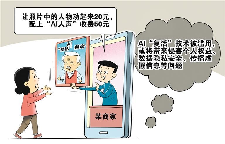 仅需一张照片和一段逝者录音,就能在数字世界中让逝者“永生”……清明节前后,此类AI“复活”广告宣传在各大电商和社交平台上日益活跃,甚至演变成一门新“生意”。技术的发展为满足人们的精神与情感需求提供了更多载体,与此同时,也有专家提出,AI“复活”技术被滥用,或将带来侵害个人权益、数据隐私安全、传播虚假信息等问题。此外,逝者生前的个人信息、聊天记录等“数字遗产”能否继承,目前没有明确法律规定。对于谁有权使用、如何避免不当获取、使用时应遵循何种规范等问题,仍需进一步明确。技术创新永无止境,其应用应有道德边界和法律规范。应抓紧完善相关法律法规,警惕AI“复活”技术可能产生的社会风险。(时 锋)