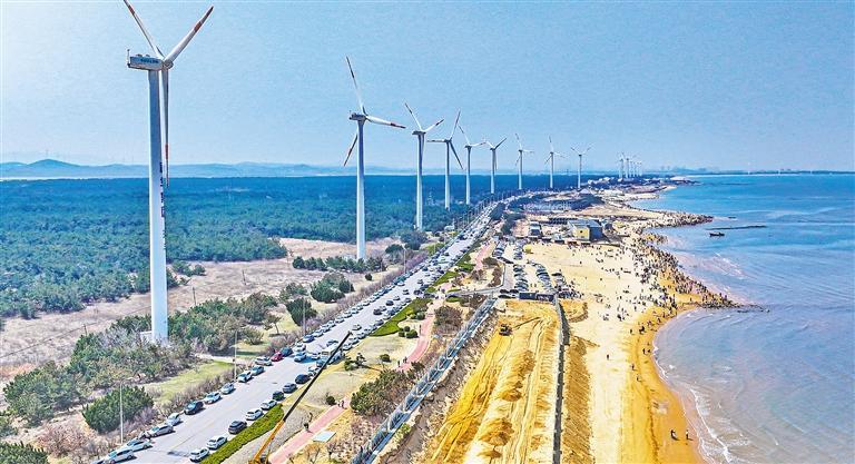山东省荣成市好运角旅游度假区北部沿海风电场,“风电长廊”风景如画。近年来,荣成市充分依托沿海自然优势和丰富的风能资源,大力发展风力发电产业,有力推动了当地经济高质量发展。