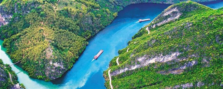 4月10日,两艘满载矿石的货船通过贵州省铜仁市沿河土家族自治县乌江银童峡。乌江全线复航以来,成为贵州水泥、磷矿、铝土矿等货物出黔运输的重要通道,年吞吐量在500万吨至800万吨之间。田茂昌摄(中经视觉)