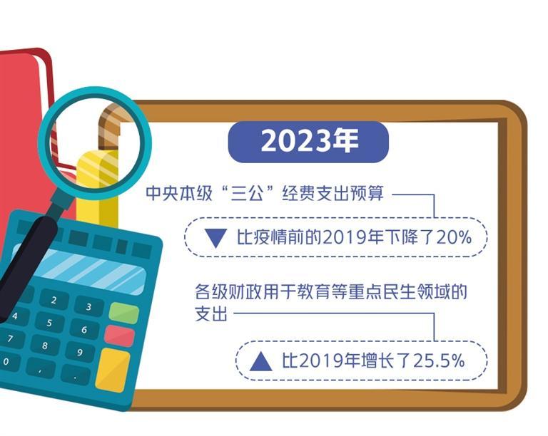 党政机关少花一分钱,民生事业就可以多安排一分钱。近年来,财政部门严格落实过紧日子的要求。2023年,中央本级“三公”经费支出预算,比疫情前的2019年下降了20%;各级财政用于教育等重点民生领域的支出,比2019年增长了25.5%。财政部近期公布的2024年中央财政预算也体现了强化预算约束的趋势,2024年中央本级一般公共预算支出增长8.6%,扣除重点保障支出后仅增长0.3%,其中重点保障国防武警支出、科技教育支出、中央储备支出、国债发行付息支出等支出项目。同时严控一般性支出,尽可能压缩中央部门支出,大力推动各部门调整优化支出结构,将资金用在刀刃上。