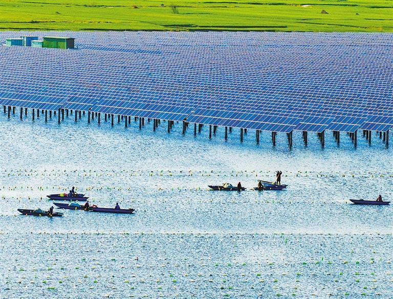 4月8日,江苏省宿迁市泗洪县魏营镇先锋水库,工人们往珍珠养殖网内投放刚嫁接的珍珠蚌。近年来,当地充分利用水资源优势,采取合作社的模式,科学实施水上光伏、中层珍珠、水下鱼虾立体套作,实现生态效益、经济效益双丰收。张连华摄(中经视觉)