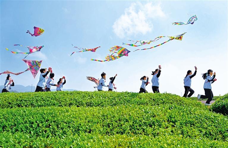 ◀4月9日,浙江省武义县三角店小学学生在满眼翠绿的茶园里放飞风筝,乐享春光。