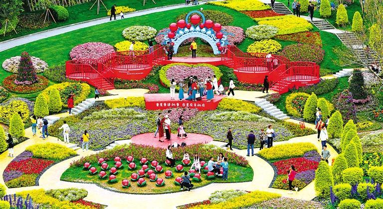 ▼4月5日,重庆市巴南区巴滨花艺园春光明媚,百花盛开,游客前来踏青游玩。