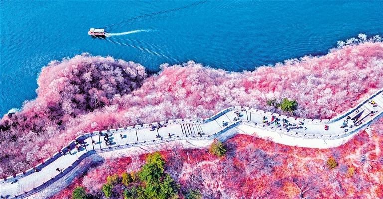 ▲4月4日,北京怀柔黄花水长城周边的山桃花竞相绽放,春意盎然,吸引众多游客前来打卡。