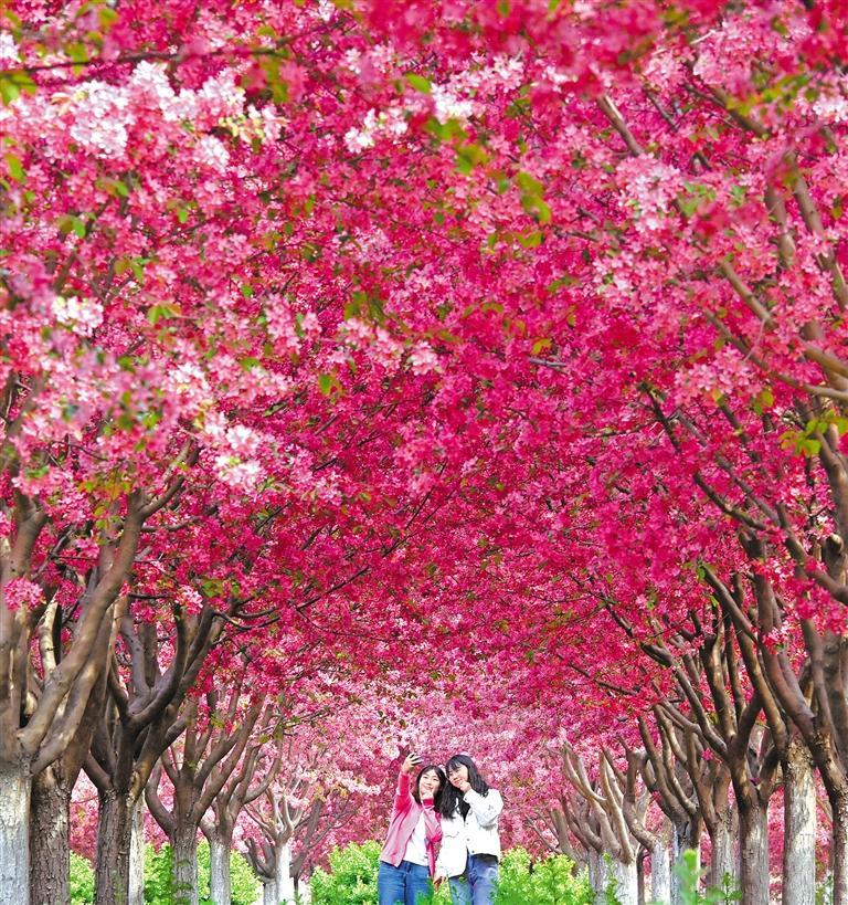 ◀4月8日,游客在河北省邯郸市峰峰矿区义井镇海棠林里赏景。