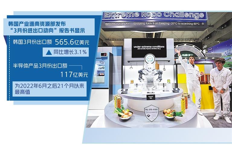 韩国产业通商资源部4月1日发布的“3月份进出口动向”报告书显示,韩国3月份出口额达到565.6亿美元,比去年同期增长3.1%。其中对出口增长贡献最大的是核心主力产品半导体,当月出口额达到117亿美元,为2022年6月之后21个月以来的最高值,甚至已恢复到新冠疫情时期因全球众多国家采取隔离措施导致IT产品需求剧增的2022年的水平。