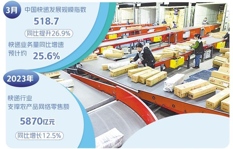国家邮政局近日发布的中国快递发展指数报告显示,3月,中国快递发展规模指数为518.7,同比提升26.9%。从分项指标来看,快递业务量同比增速预计约为25.6%。
