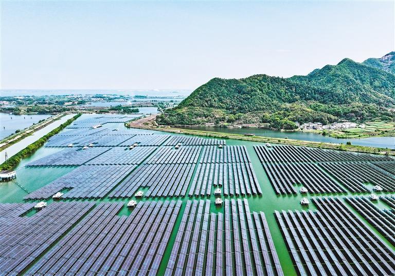 4月9日,江西省瑞昌市武蛟乡达尔湖50兆瓦光伏发电站与周边景致浑然一体。近年来,瑞昌市坚持生态优先、绿色发展,将光伏产业与渔业养殖相结合,充分挖掘资源优势,形成了“水上能发电、水下能养鱼”的局面。魏东升摄(中经视觉)