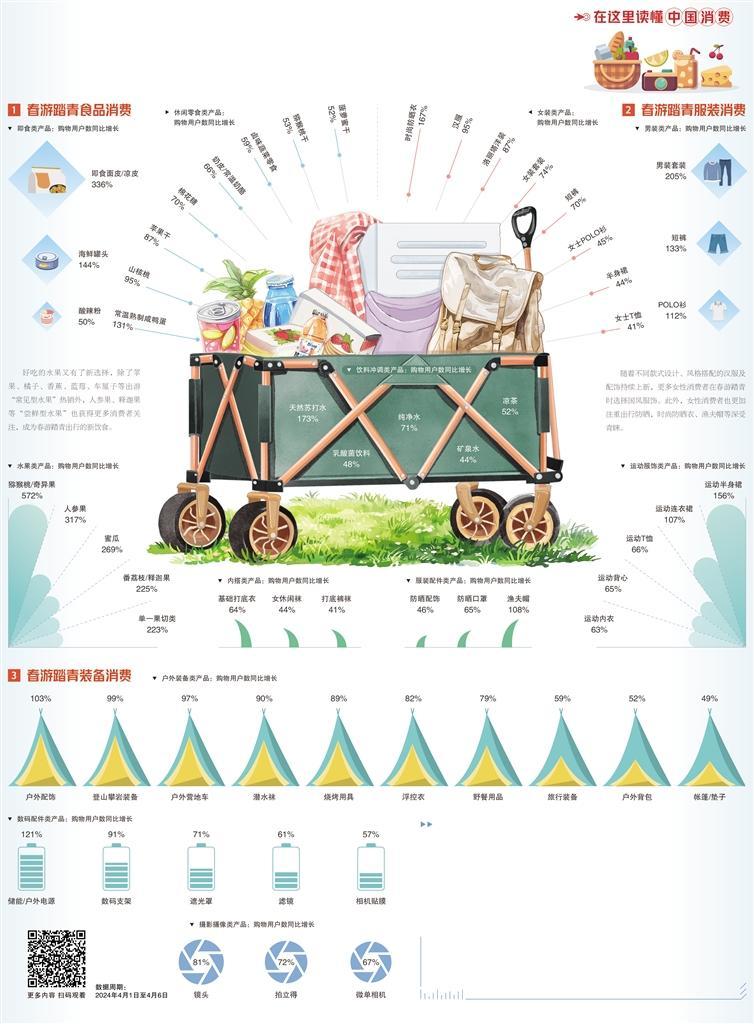 春游踏青当然也少不了各种美味,即食产品、休闲零食以及各类水果,都是消费者春游踏青的必备品。即食类产品中,即食面皮、凉皮、海鲜罐头的购物用户数增速亮眼;水果类选择上,人参果、释迦果等“尝鲜型水果”获得了更多消费者的关注;休闲零食类产品中,常温熟制咸鸭蛋、山核桃、苹果干、卤味蔬菜零食等多样化的零食产品热销;饮品方面,天然苏打水、凉茶、乳酸菌饮料等更获青睐。