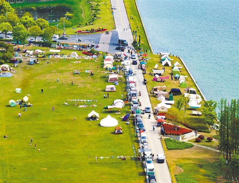 4月14日,江苏省昆山市淀山湖畔,春色烂漫,正值赏景好时节,众多市民和游客来此露营休闲,享受春日周末时光。袁新宇摄(中经视觉)
