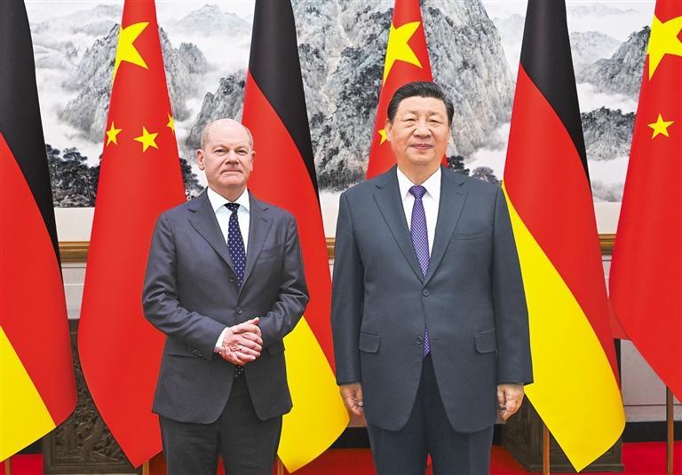 习近平指出,中德产业链供应链深度互嵌,两国市场高度依存。中德互利合作不是“风险”,而是双方关系稳定的保障、开创未来的机遇。无论是机械制造、汽车等传统领域,还是绿色转型、数字化、人工智能等新兴领域,两国都有合作共赢的巨大潜力亟待挖掘。双方应该发扬互利共赢的鲜明特色,彼此成就。中国出口电动汽车、锂电池、光伏产品等,不仅丰富了全球供给,缓解了全球通胀压力,也为全球应对气候变化和绿色低碳转型作出巨大贡献。中德两国都是以实业立国,都支持自由贸易和经济全球化。双方要警惕保护主义抬头,坚持以市场眼光和全球视野,从经济规律出发,客观、辩证看待产能问题,多探讨合作。中国坚持对外开放基本国策,希望德方为中国企业赴德发展提供公平、透明、开放、非歧视的营商环境。中德在世界多极化问题上有不少共通之处。多极化本质上应该是不同文明、不同制度、不同道路的国家之间相互尊重、和平共处。中德应该独立自主开展多边领域协作,推动国际社会用实际行动更好应对气候变化、发展不平衡、地区冲突等全球性挑战,为世界的平衡稳定作出更多贡献。
