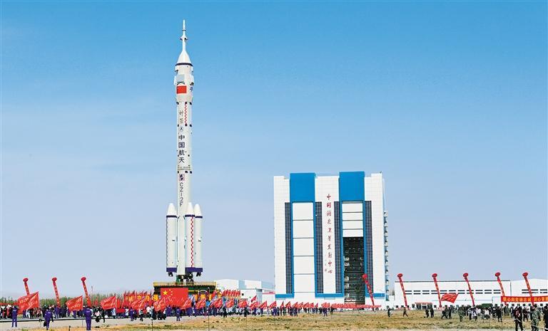 4月17日,神舟十八号载人飞船与长征二号F遥十八运载火箭组合体在垂直转运中。