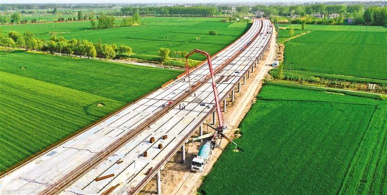 4月16日,安徽省蒙城县亳州至蒙城高速二期项目建设现场,工人正在有序施工。该项目全长约92.6公里,建成后将完善皖北地区高速路网,推动区域经济发展。胡卫国摄(中经视觉)
