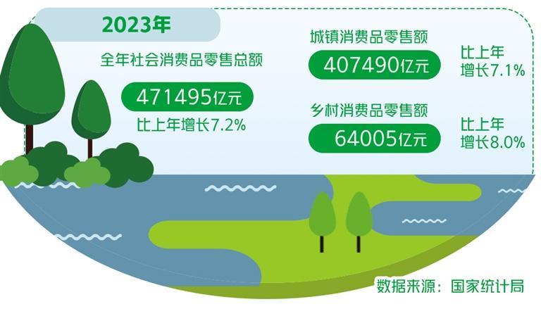 开拓农村消费市场是扩大内需的重要一环。近年来,农村消费市场表现出更为显著的提质扩容潜力。从消费升级趋势看,农村与城市形成梯次消费升级的格局。2023年,农村居民人均可支配收入21691元,比上年增长7.7%,扣除价格因素,实际增长7.6%。农村居民人均可支配收入中位数18748元,增长5.7%,与城镇居民相比还有较大差距。部分农村地区耐用消费品还未饱和,农村消费升级带来的需求空间很大。从产业发展态势看,产业布局调整推动形成新的消费力量。许多行业在发展成本更低的县域市场布局,特别是数字技术的广泛应用和渗透加速了产业转移趋势,吸引更多人才返乡入乡创业就业,同时带动消费,在客观上扩大了农村消费市场的规模,形成新的消费力量,亦对农村居民产生了示范带动作用,县域以及乡村的休闲娱乐消费需求持续增加,城市消费方式加速在乡村复制。从城乡融合角度看,农村日益成为城乡居民融合互动的消费场所。乡村旅游成为全国文旅市场新热点,越来越多的消费者选择“反向旅游”“体验式旅游”,乡村休闲旅游等新业态加快发展,给农村带来可观的消费增量。