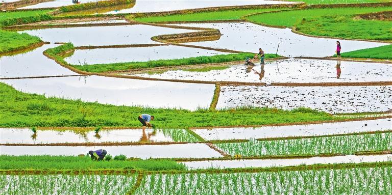 4月21日,重庆市开州区厚坝镇,农民正在进行耙田、施肥、拔秧、栽插等工作,呈现出一幅生机勃勃的乡村春耕图景,为当地粮食丰产丰收打下坚实基础。王晓宇摄(中经视觉)