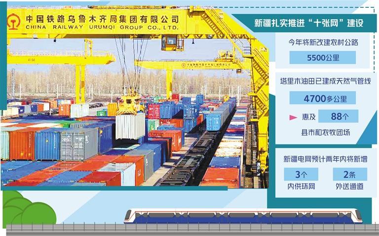 内供外联的电力网是新疆着眼于积极扩大有效投资、构建现代化基础设施体系,今年确定密织的“十张网”之一,其他“九张网”为东联西出的铁路网、通行便利的公路网、干支联通的航空网、调控有力的水利网、覆盖广泛的天然气管网、高效畅通的商贸物流网、绿色低碳高效的算力网、集约便捷的地下管网、联通欧亚的跨境网。