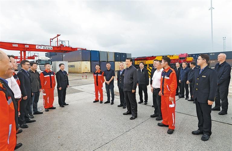 随后,习近平来到重庆铁路集装箱中心站,听取货物集散、运输路径、运营成本和效益等介绍,同货车司机、列车司机、装卸工人、场站管理人员等亲切交流,询问他们的工作强度、劳动保护、节假日休息和收入情况。习近平说,大家在物流一线,也是在对外开放一线,通过你们的辛勤劳动,很多商品跨越山海、走向世界,你们的工作很有意义。推动西部大开放、促进西部大开发,物流很重要,大家要继续努力,不断创造新的业绩,作出新的贡献。