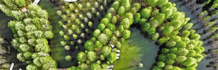 4月24日,江苏省泗洪县洪泽湖湿地景区内,水杉林一片翠绿。
