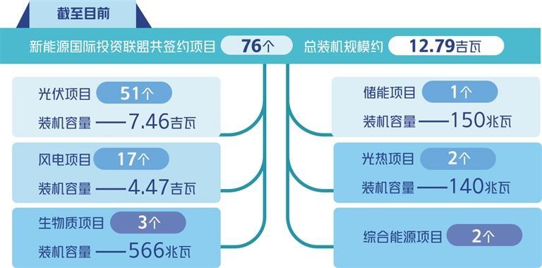 截至目前,联盟共签约项目76个,总装机规模约12.79吉瓦。其中包括光伏项目51个,装机容量7.46吉瓦;风电项目17个,装机容量4.47吉瓦;生物质项目3个,装机容量566兆瓦;储能项目1个,装机容量150兆瓦;光热项目2个,装机容量140兆瓦;综合能源项目2个。此外,联盟现有储备项目总装机规模约15吉瓦。