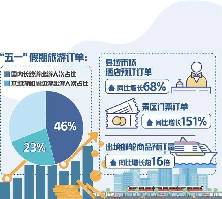 从出游目的地看,北京、上海、重庆、杭州、成都、南京、西安、武汉、广州等城市是热门,带动相关交通和酒店订单量走高。去哪儿旅行网显示,北京—上海、成都—西安、上海—武汉、深圳—长沙、北京—青岛等热门线路的火车票预约购票难度不低于春运;从上海、北京、深圳、广州、杭州、南京等地出发,飞往旅游城市的机票平均支付价格走高,北京—成都、上海—昆明等热门航线的部分航班已升至全价;在携程旅行网上,天水、徐州、淄博、合肥、南昌、迪庆、烟台等城市的“五一”假期酒店预订增速明显;四线及以下城市,尤其是县域旅游市场带来新增量,县域市场酒店预订订单同比增长68%、景区门票订单同比增长151%。